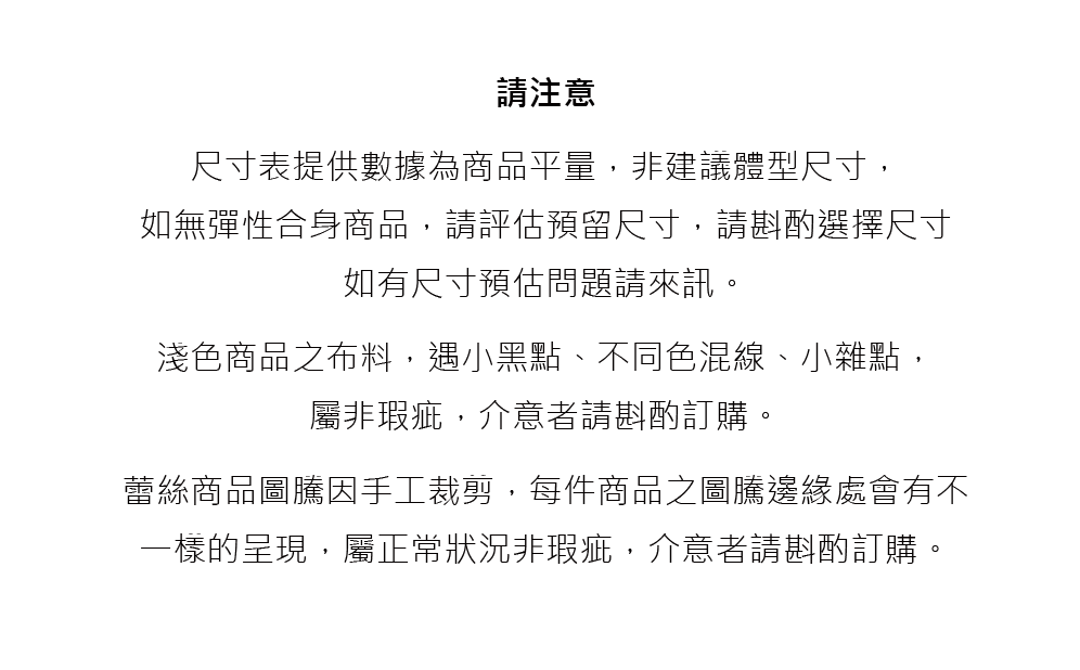 訂購前請務必評估仔細,無法因商品有瑕疵而受理退換貨,如對商品有高標準,請購買正價商品,避免爭議。