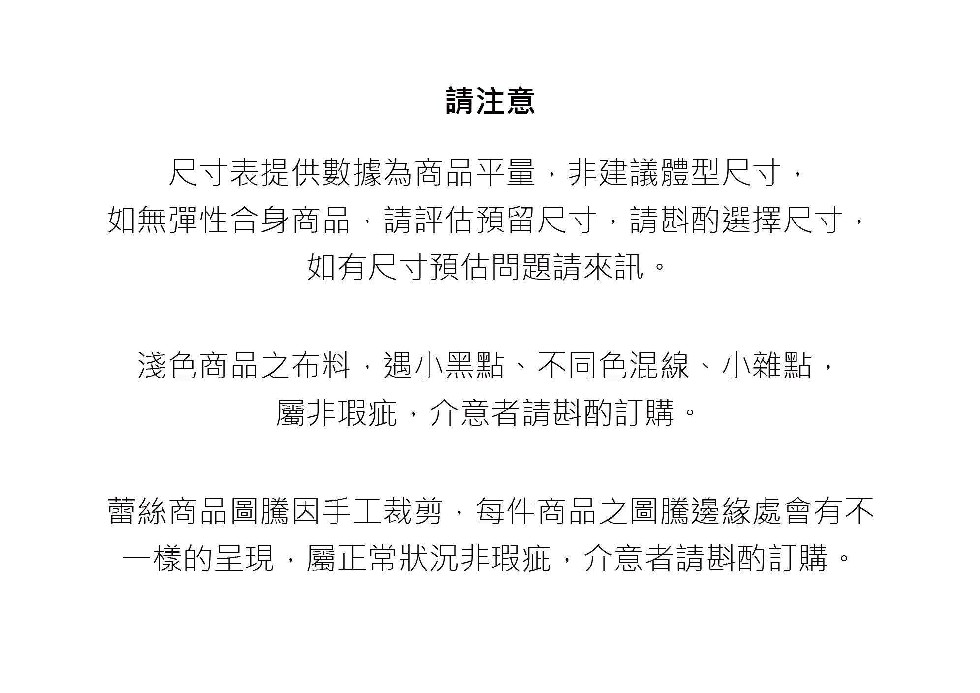 訂購前請務必評估仔細,無法因商品有瑕疵而受理退換貨,如對商品有高標準,請購買正價商品,避免爭議。